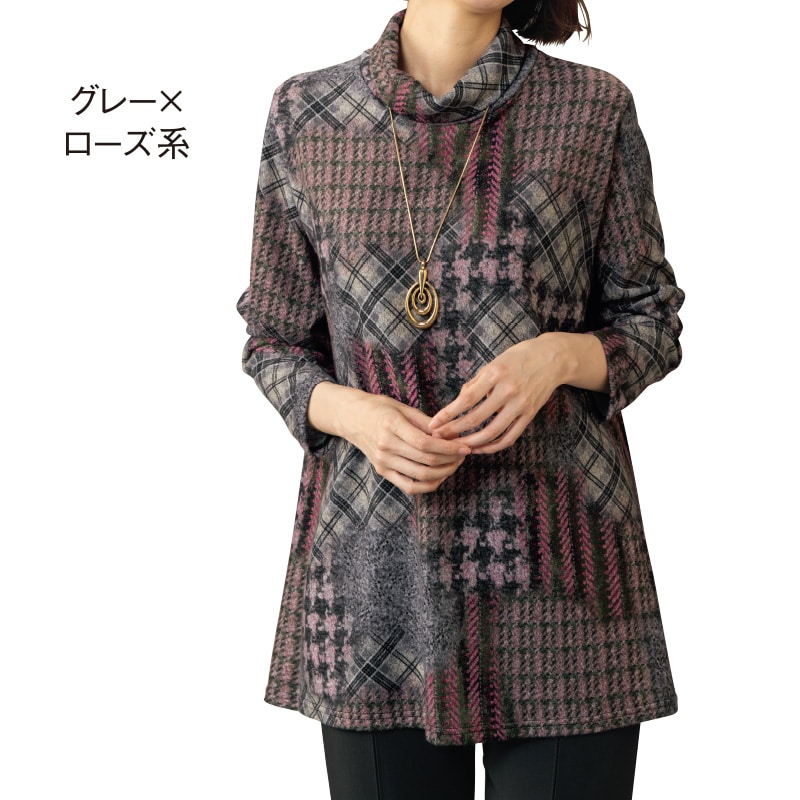 一枚で華やぐパッチワーク柄が素敵な微起毛素材のロングプルオーバー。体型カバーも着心地もおすすめなアイテムです。
