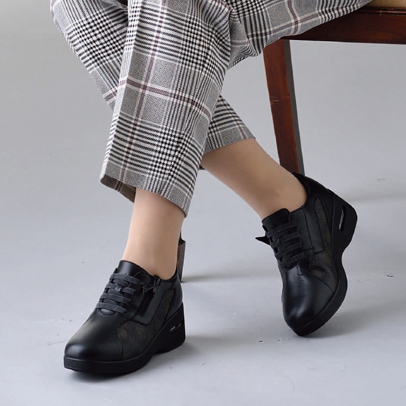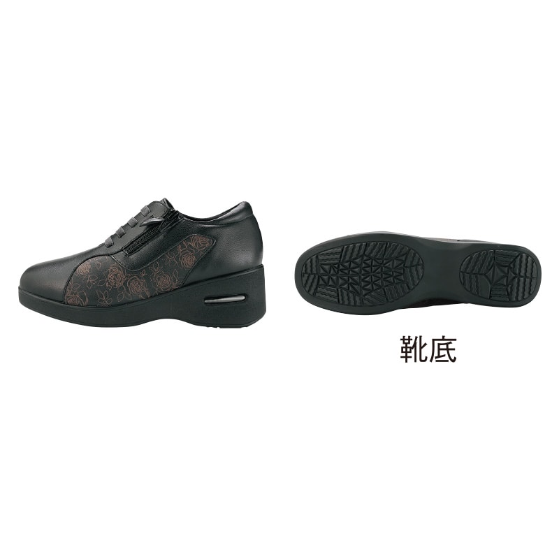 足への負担を軽くするエアーソール仕様。 底素材も軽くてすり減りにくいPU素材を採用。 丈夫で軽い山羊革に特殊なレーザー加工技術で 美しいバラを表現しました。 サイドファスナーで脱ぎ履き楽ちん。 ゴムシューレースなのもうれしいですね。