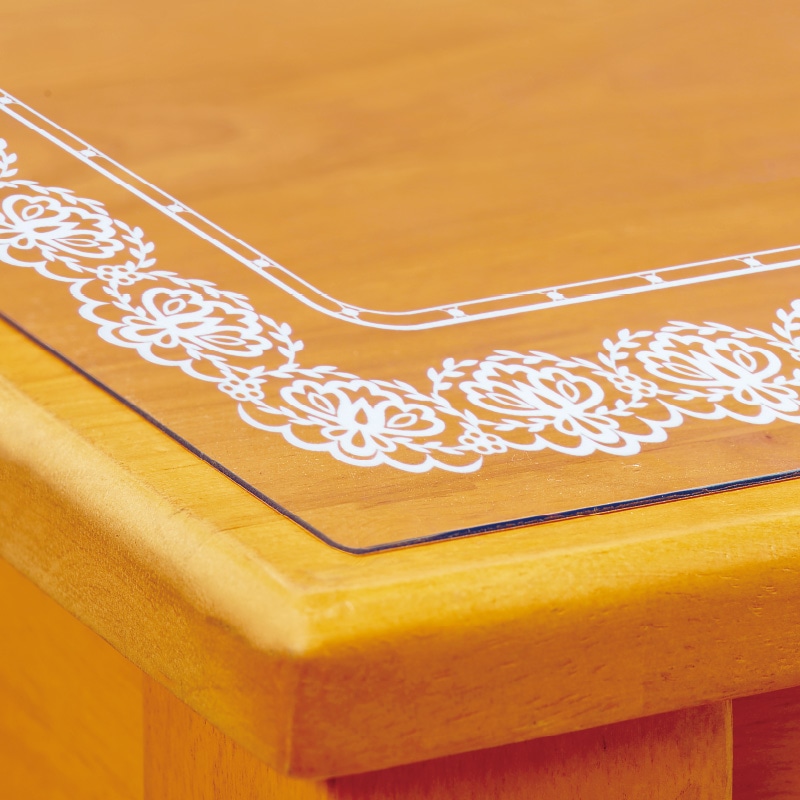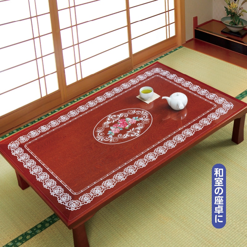 ベースが透明のテーブルマット。 テーブルの雰囲気を残しつつキズ対策できます。 レースとバラの柄が華やかで上品なアクセントに!