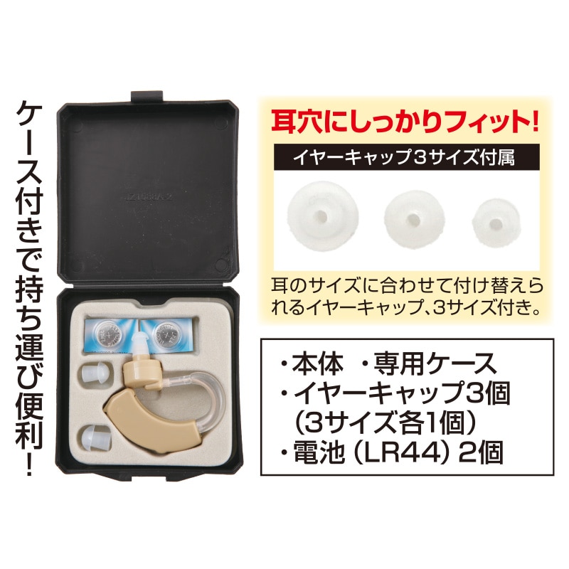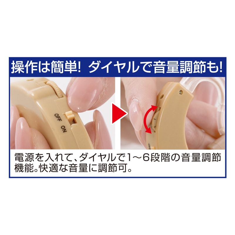 - 便利 な耳かけ型集音器。肌に近い色で目立ちにくく、左右どちらでも装着可能。ケース付きで持ち運びも便利です。操作は簡単。電源を入れて、ダイヤルで1~6段階の音量調節 するだけ。快適な音量に調節できます。