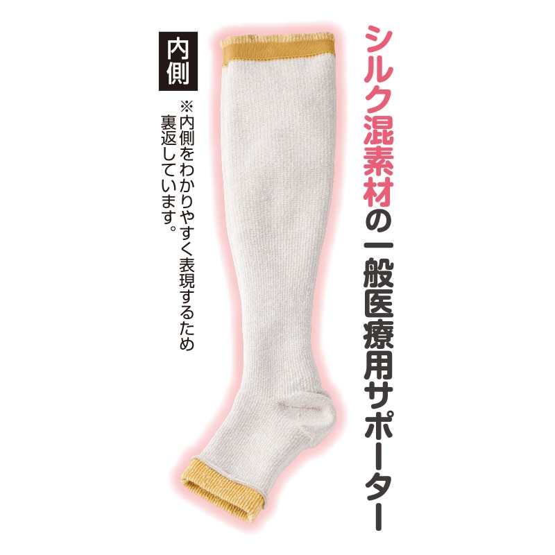 血行促進・足つり改善・むくみ軽減。装着部(下肢)の血行促進及び、むくみの軽減と予防ができる一般医療用サポーターです。肌にあたる内側にシルク混素材を使用。贅沢でやさしい肌触りです。