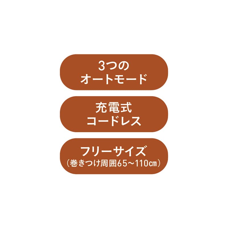 - セット内容/本体、充電用ケーブル、取扱説明書(保証書付) 主材/コントローラー:ABS樹脂+PC(ポリカーボネート) ベルト:ポリエステル、ポリウレタン、ナイロン、その他 仕様/電源:充電式(リチウムイオン電池内蔵2,400mAh/3.7V) 消費電力:8W 保証期間:1年 充電時間:約220分 連続使用時間:【エアー+温感】約90分 【エアーのみ】約140分 電源アダプターの推奨規格:5V/1A以上 本体重量(約)/575g 本体サイズ(約)/幅120×奥行25.3×高さ5.3㎝ 適応サイズ:巻き付け周囲約65~110㎝ 中国製