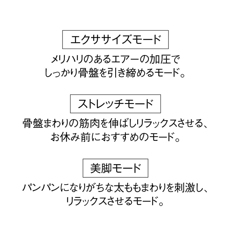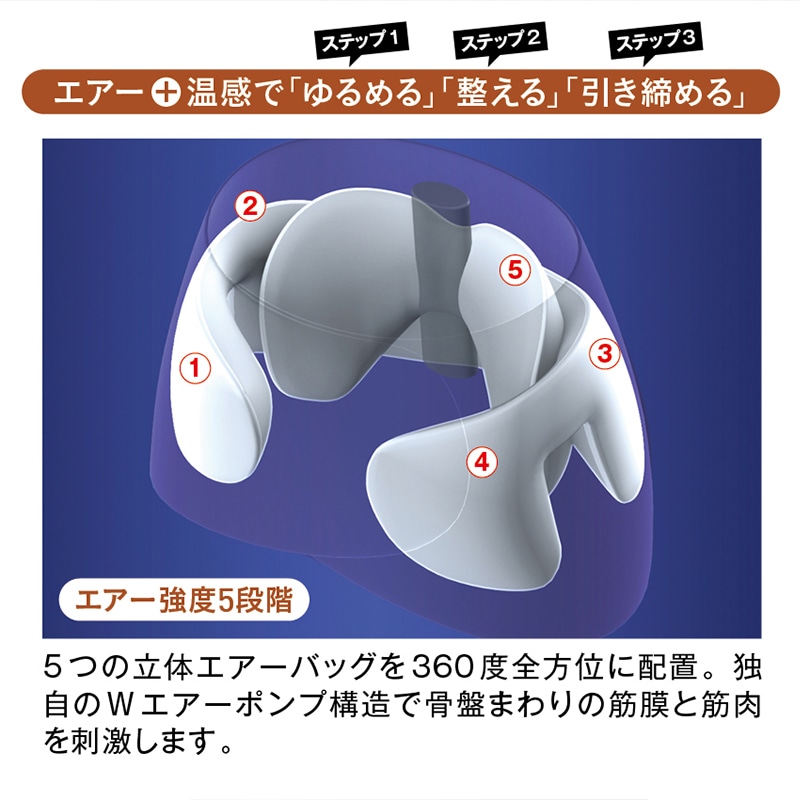 - 骨盤まわりを360度全方位から加圧するエアーベルト。さらに温感機能を搭載し、ゆるめてさらに整えやすく進化しました。巻くだけで筋力アップにつながるのが嬉しいポイント。運動不足や食べすぎで気になるおなかまわり、ぐんぐん刺激しませんか?