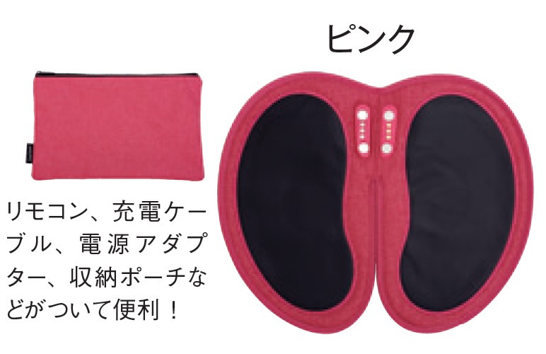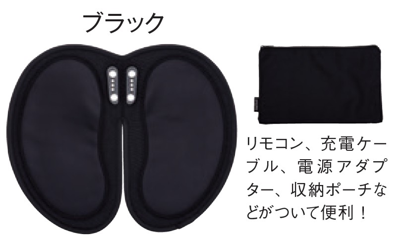 - セット内容/本体、パッド、リモコン(テスト電池CR2025 つき)、収納ポーチ、充電用ケーブル、電源アダプター、取扱説明書(保証書つき) 主材/パッド:ポリエステル、PVC、導電性シリコーン、ABS 樹脂 本体:ABS 樹脂 リモコン:ABS樹脂 収納ポーチ:ポリエステル 仕様/電源:充電式(リチウムイオン電池内蔵1,800mAh / 3.7V ) 本体+パッド重量(約)/ 210g 耐荷重(約):パッド100kg、温感レベル/ 2 段階(弱38℃、強42℃) AC100 ~ 240V 消費電力最大15W 中国製 保証期間/ 1 年 充電時間/約180 分 連続使用時間/ EMS+ 温感 約40 分、EMS のみ約2,100 分 ※ 1 TPC マーケティングリサーチ(株)調べ。2024 年5 月16 日 温感機能つき脚用EMS 機器として(足裏全体を温める機能において)。