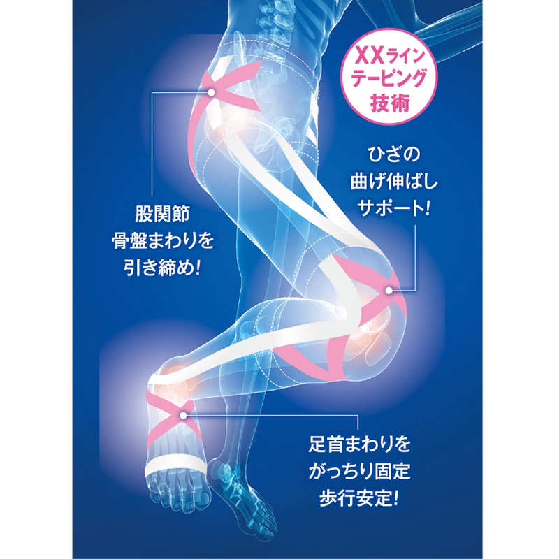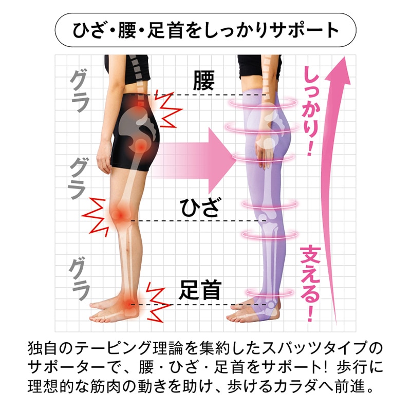 テーピング理論をもとに編み地を変えて圧の強弱をつけ、歩行の手助けをするスパッツです。薄いのに腰やひざ、足首をがっちりサポートして関節のねじれやグラつきをサポート。はくだけで下半身の動きが驚くほど楽になります。