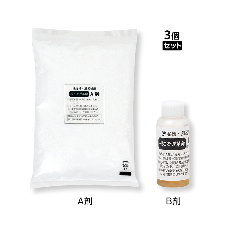 セット内容/A剤3袋・B剤3本 取説1枚 主材/A剤:過炭酸ナトリウム B剤:発泡促進剤 重量(約)/A剤:400g/袋 B剤:20?/本 日本製 ※ご使用の状況により効果は異なります。