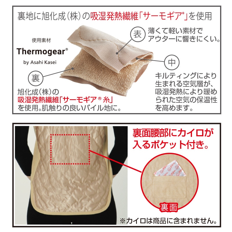 軽くて薄いから着ぶくれしにくい! インナーウエアとして1枚着るだけ。アウターに響きにくく、シャツやブラウスの下に着てもOK! 何枚も重ね着する必要はありません。裏面腰部にカイロが入るポケット付き。