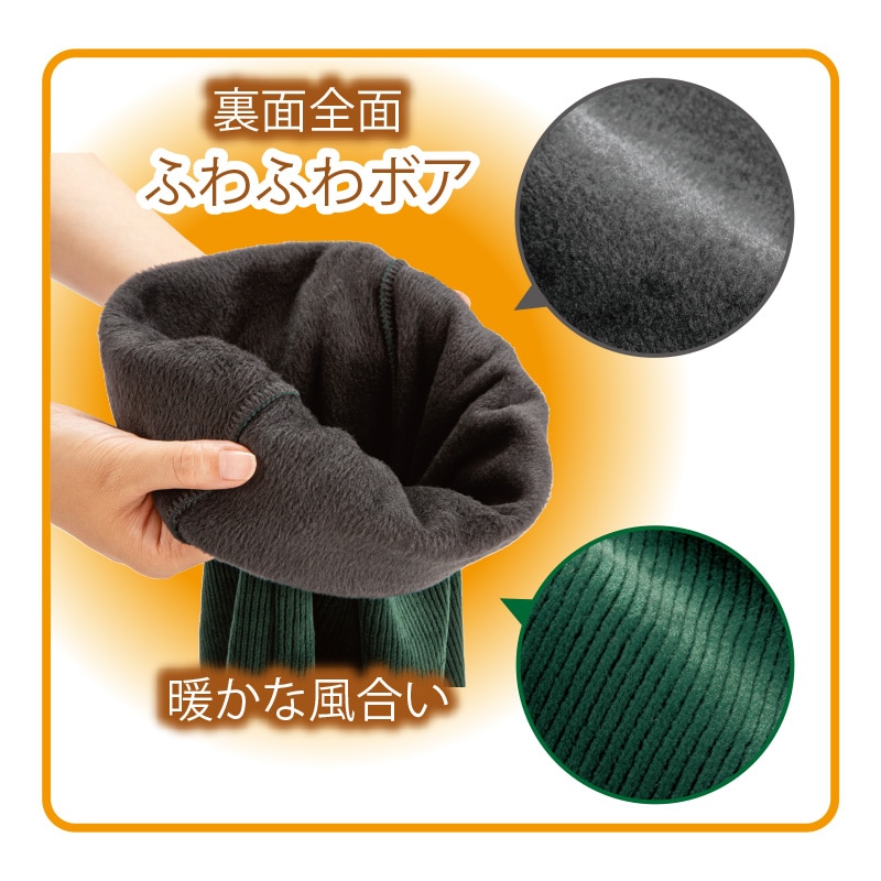 暖かな風合いのコーデュロイを裏側全面にふわふわボアがついたワイドパンツに仕立てました。寒い日の外出が楽しくなるパンツです。
