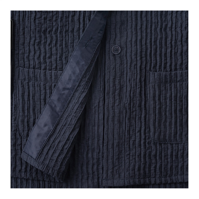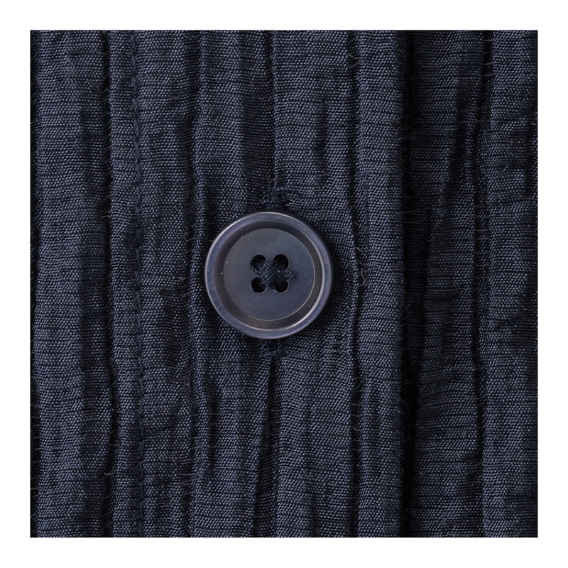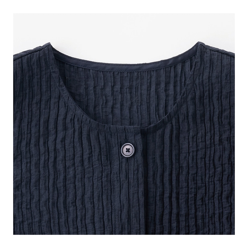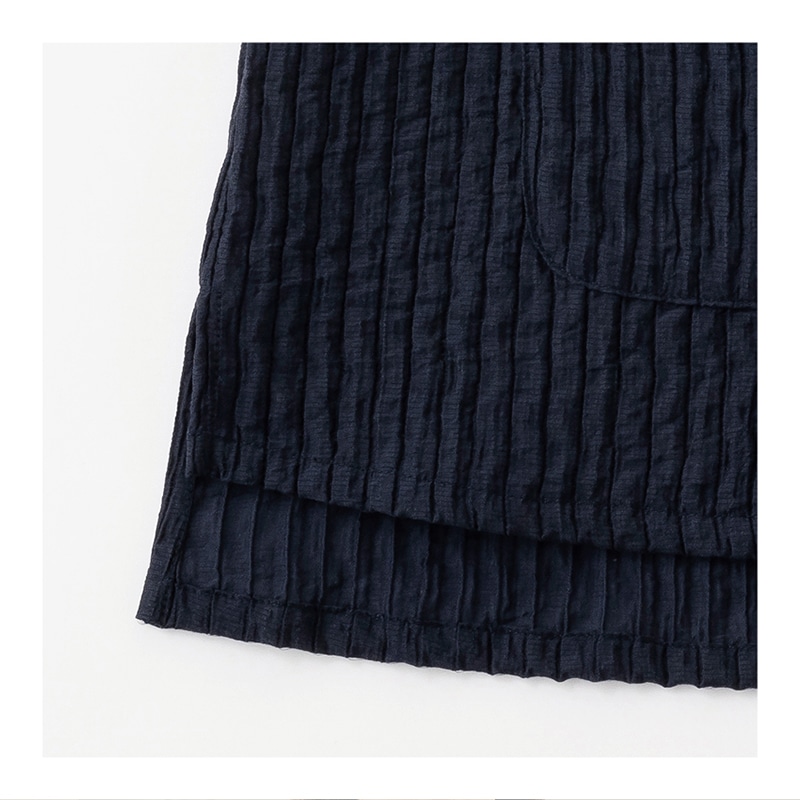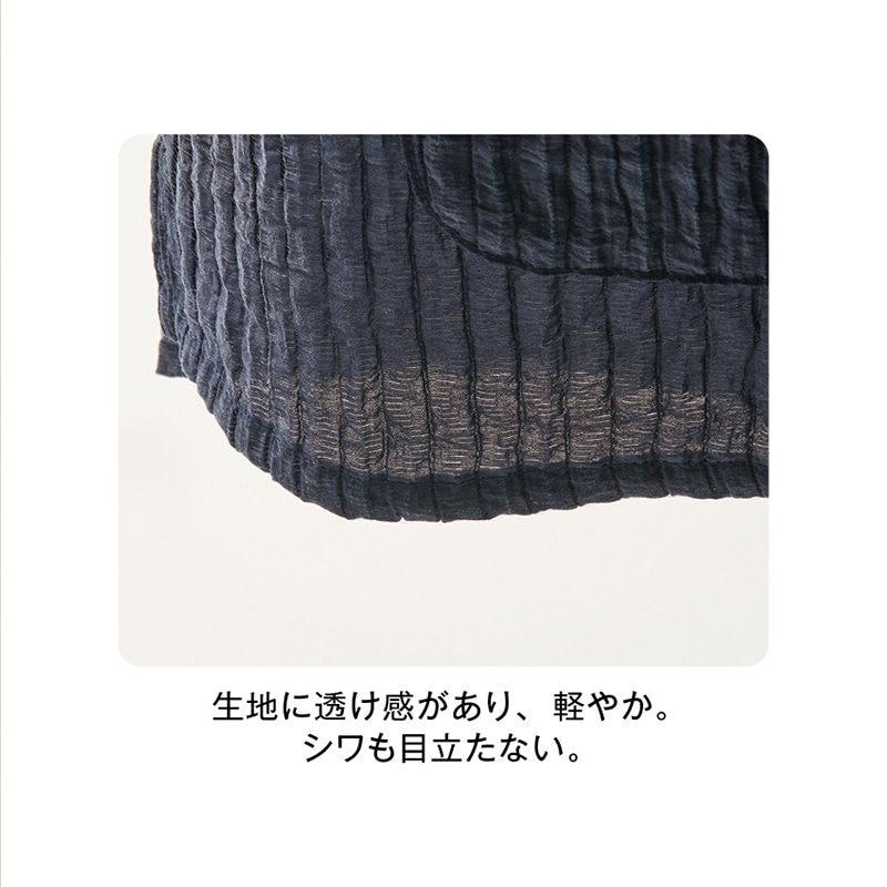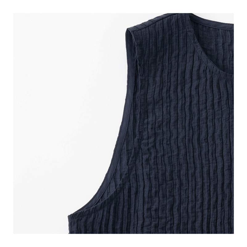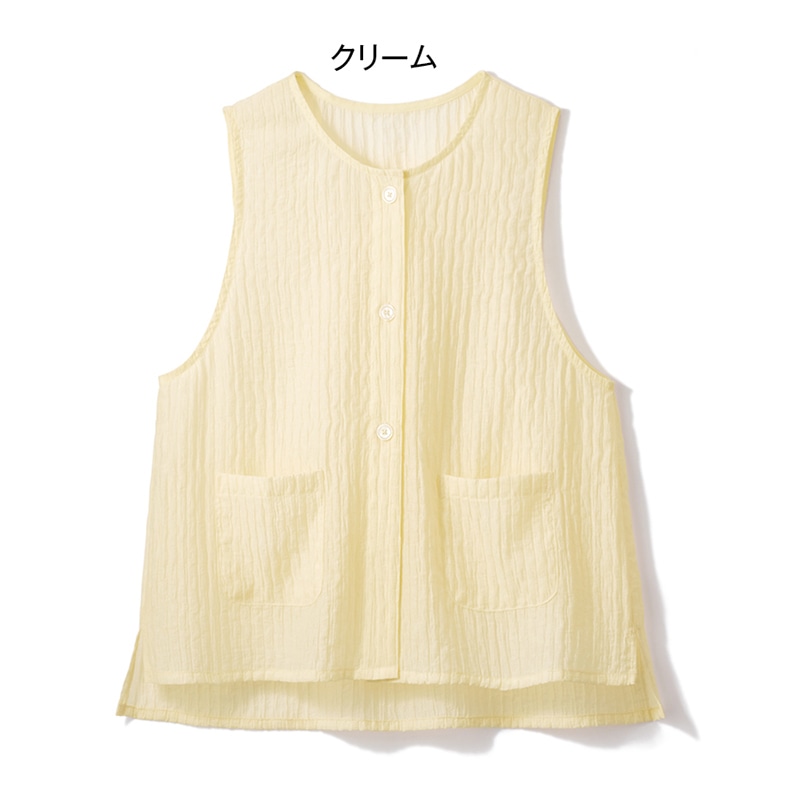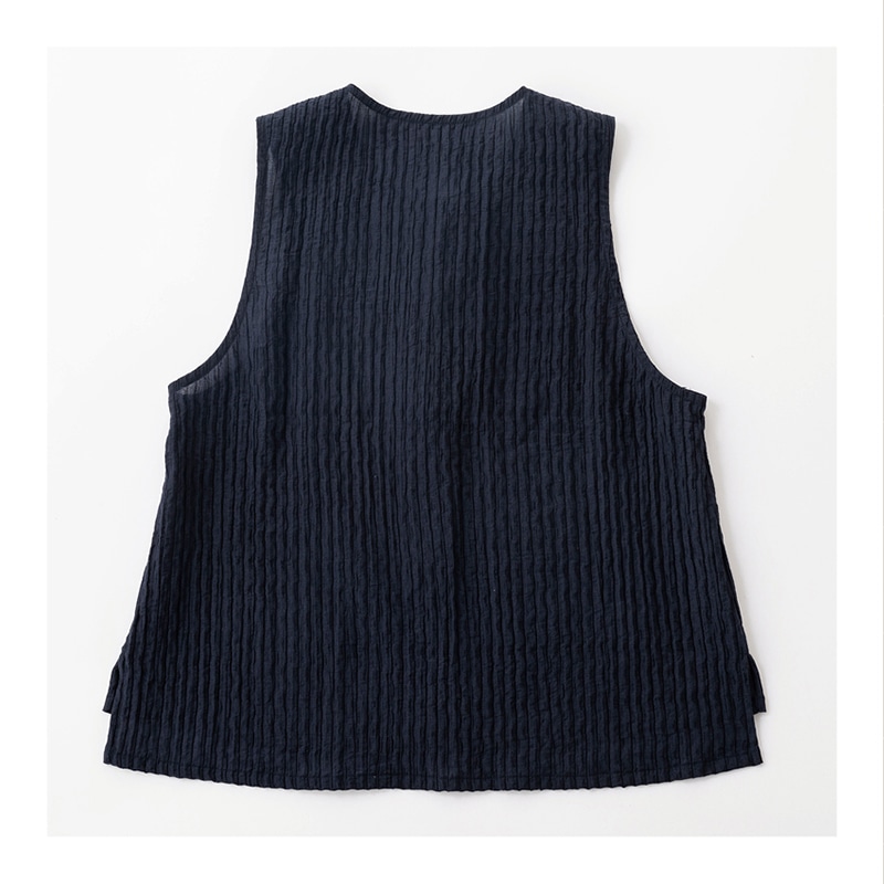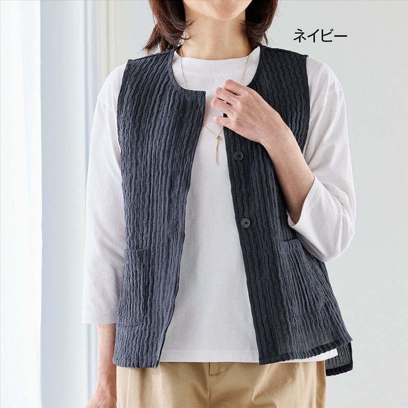 バッグの中に丸めて入れてもかさばらずシワにもなりにくいベスト。生地に縦ラインが入って表情があり、軽くて持ち歩きにも便利。旅行のお供にもおすすめです。