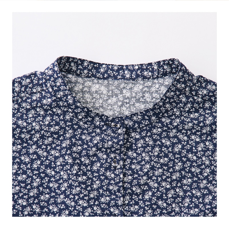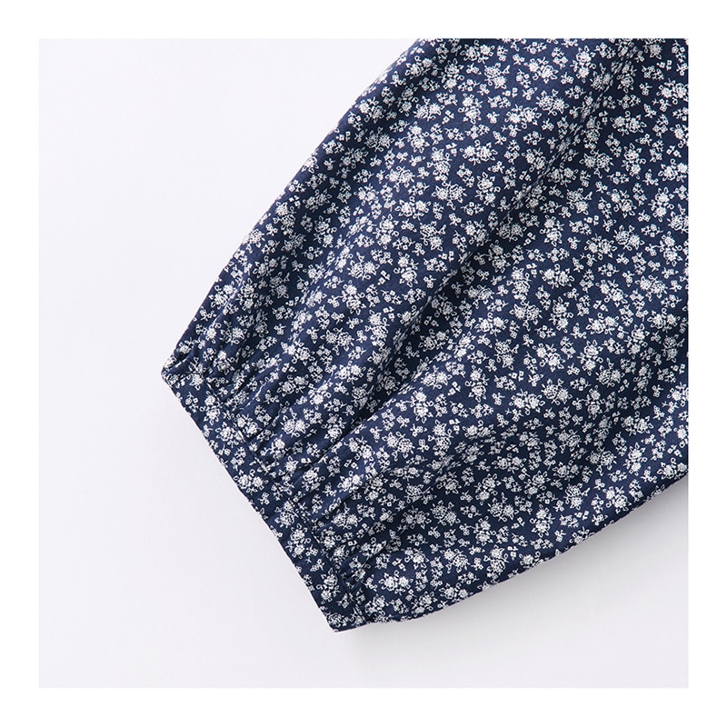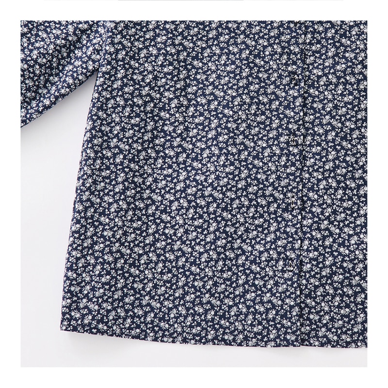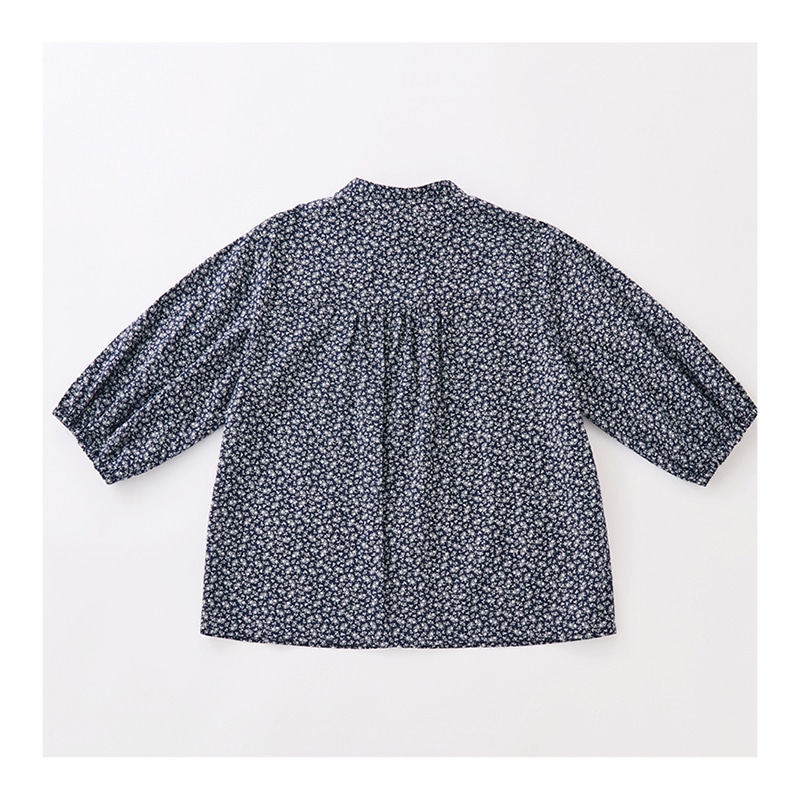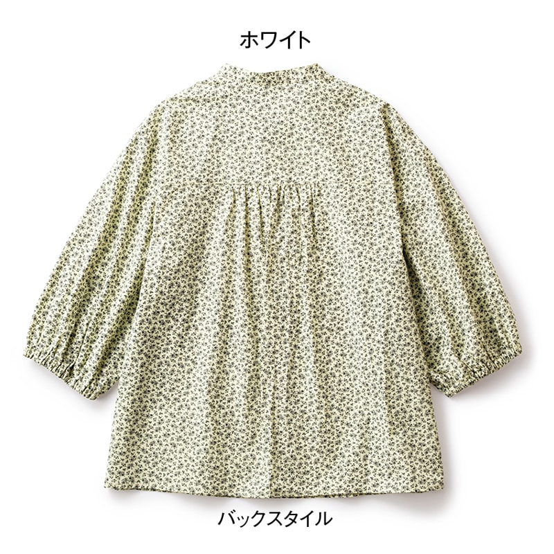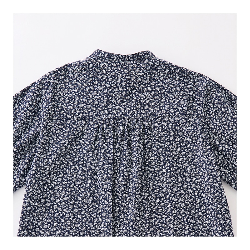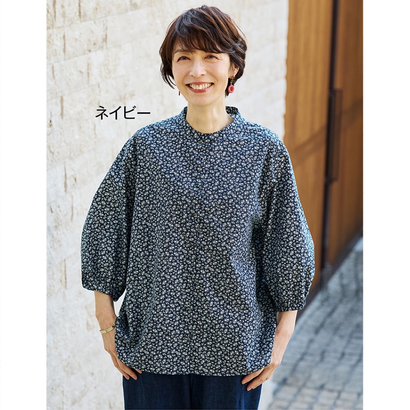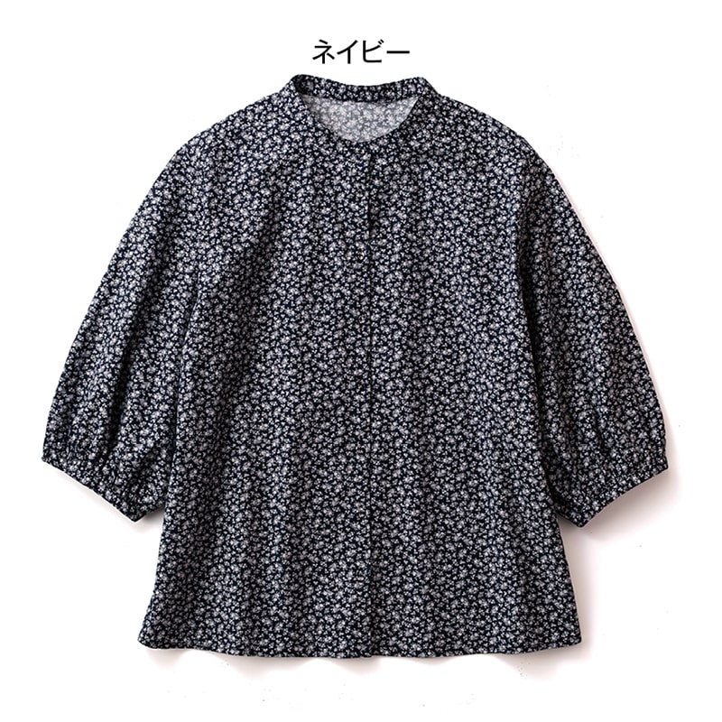 全体に小花を散らしたふんわりシルエット。三角や丸形の襟がついていないので首元がスッキリ見えると人気のバンドカラー、袖は7 分丈で季節をまたぐ春から夏におすすめです。