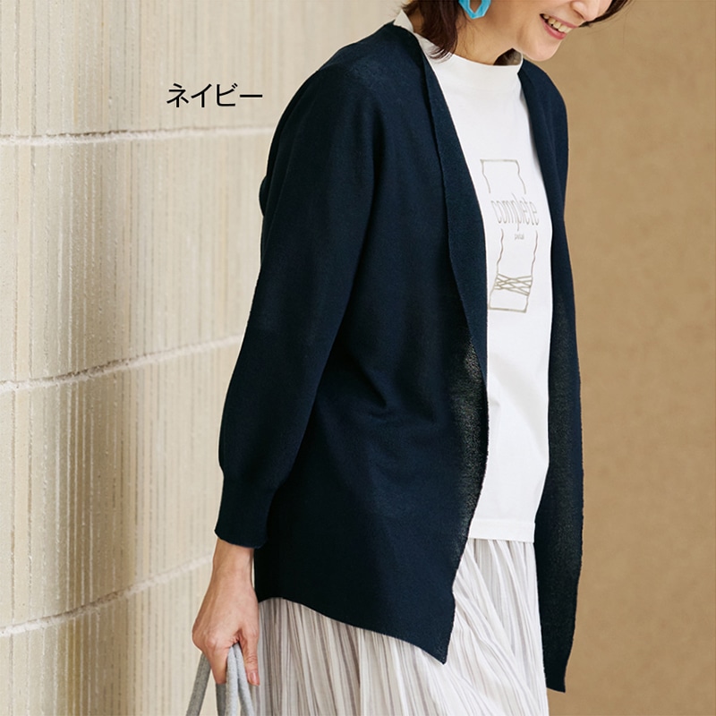 ジャケットのきちんと感とカーディガンの軽やかさを掛け合わせたニットジャケット。縫い目がない縫製で、体になめらかになじみ美しいラインも叶います。襟元のゆるやかなシルエットが女性らしさを演出します。