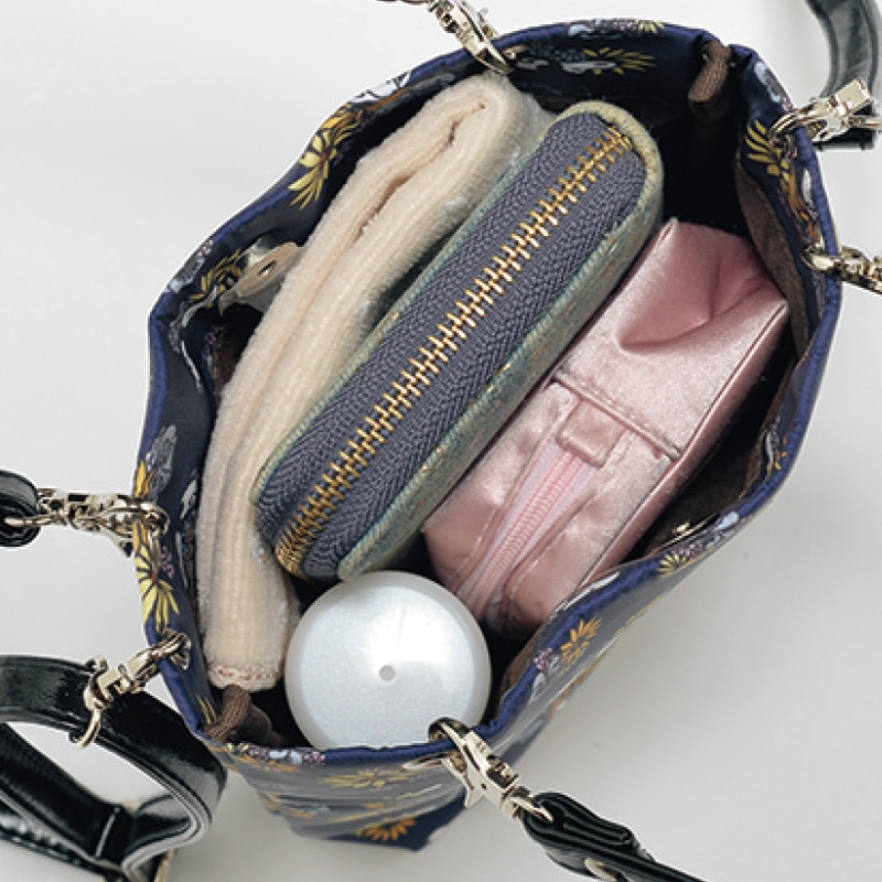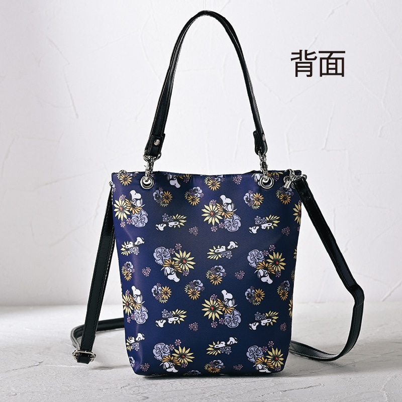 色/ネイビー サイズ(約)/タテ20×ヨコ20(上部)・14(下部)×マチ5㎝ 持ち手立上がり:15㎝(取外し可) ショルダー紐長さ:34~65㎝(取外し可、フリースライド式) 重量(約)/170g 素材/外面:ポリエステル 内側:ポリエステル 付属:合成皮革 仕様/マグホック式開閉口 内部:オープンポケット×1 ※生産の都合により柄の出方が異なる場合があります。 中国製