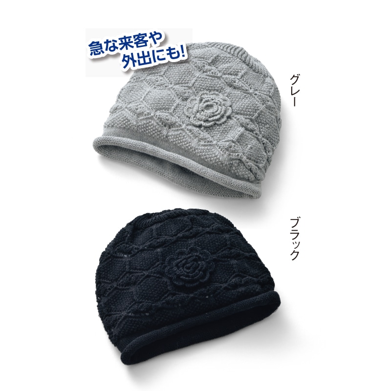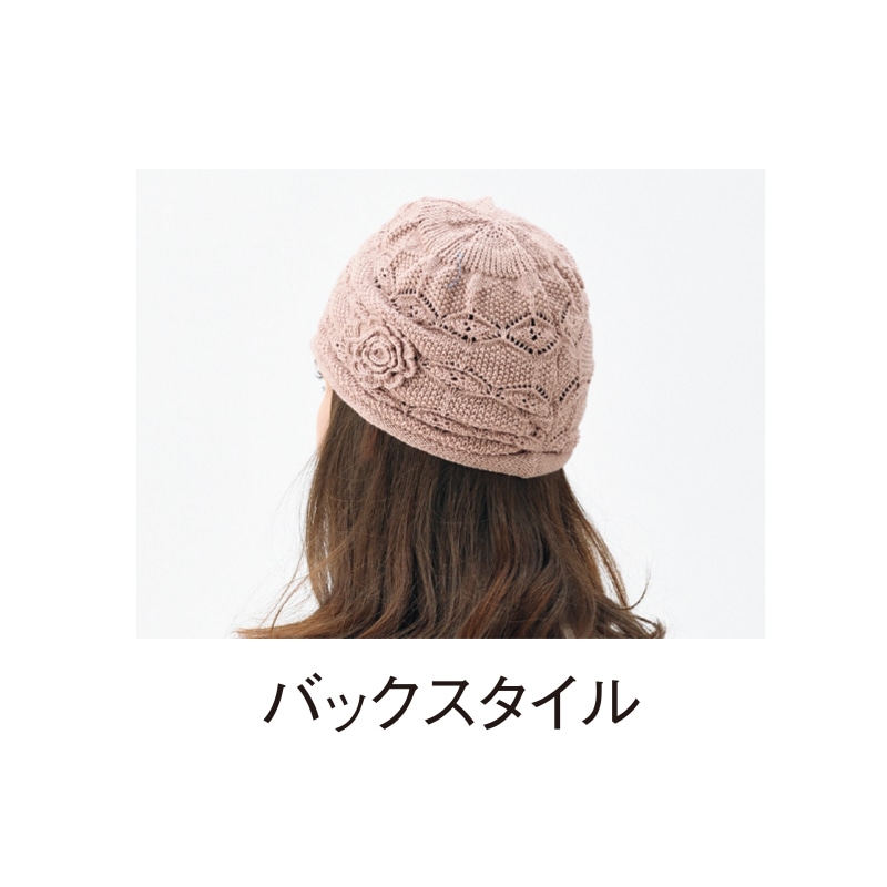 髪がペタッとしにくいゆったりシルエット。 ニット編みなので、通気性があり快適なかぶり心地。