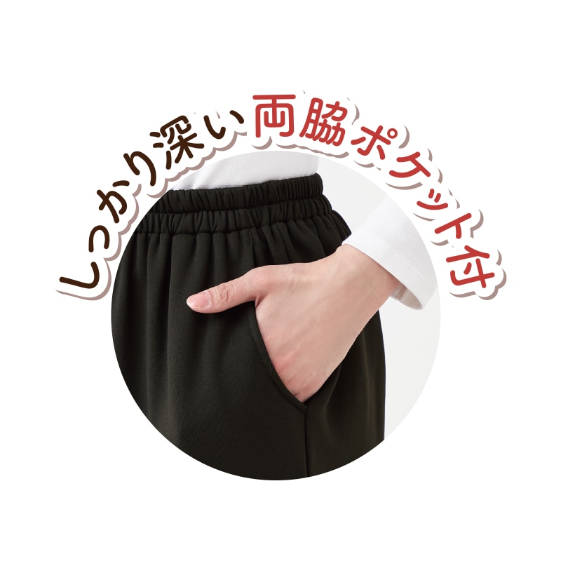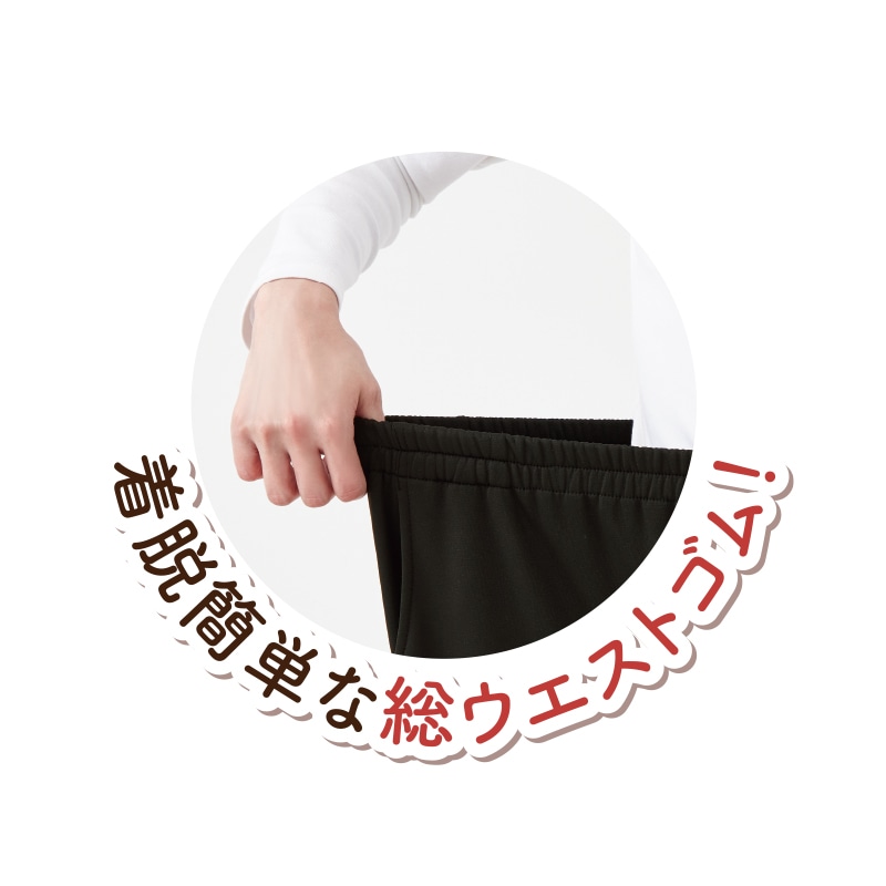 素材/ポリエステル95%・ポリウレタン5% 仕様/ウエスト総ゴム、両脇ポケット付 日本製 洗濯機(ネット使用) *単位(cm) *カッコ内の数値は適応サイズ。