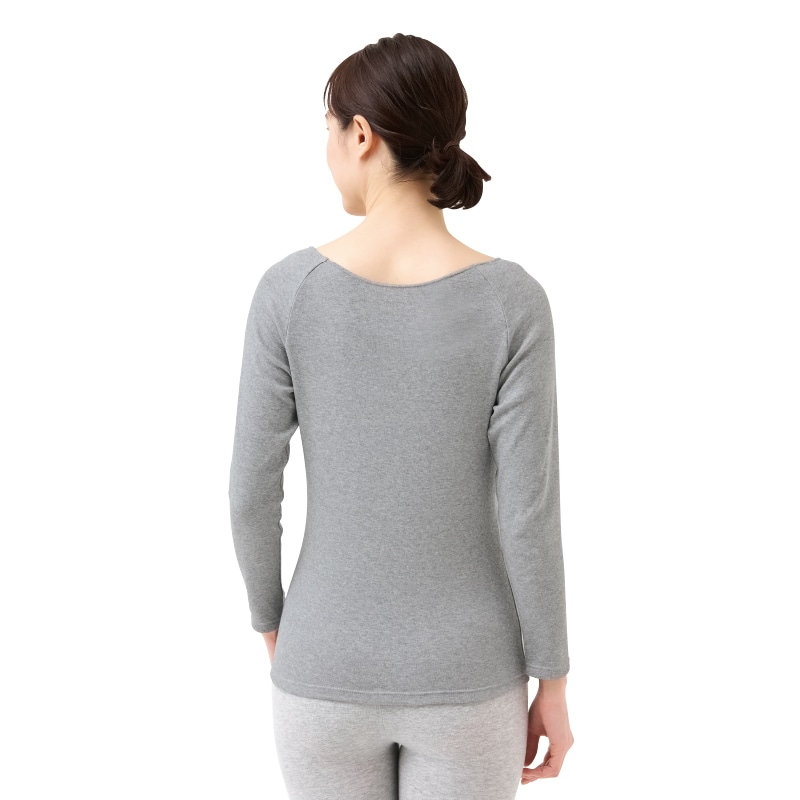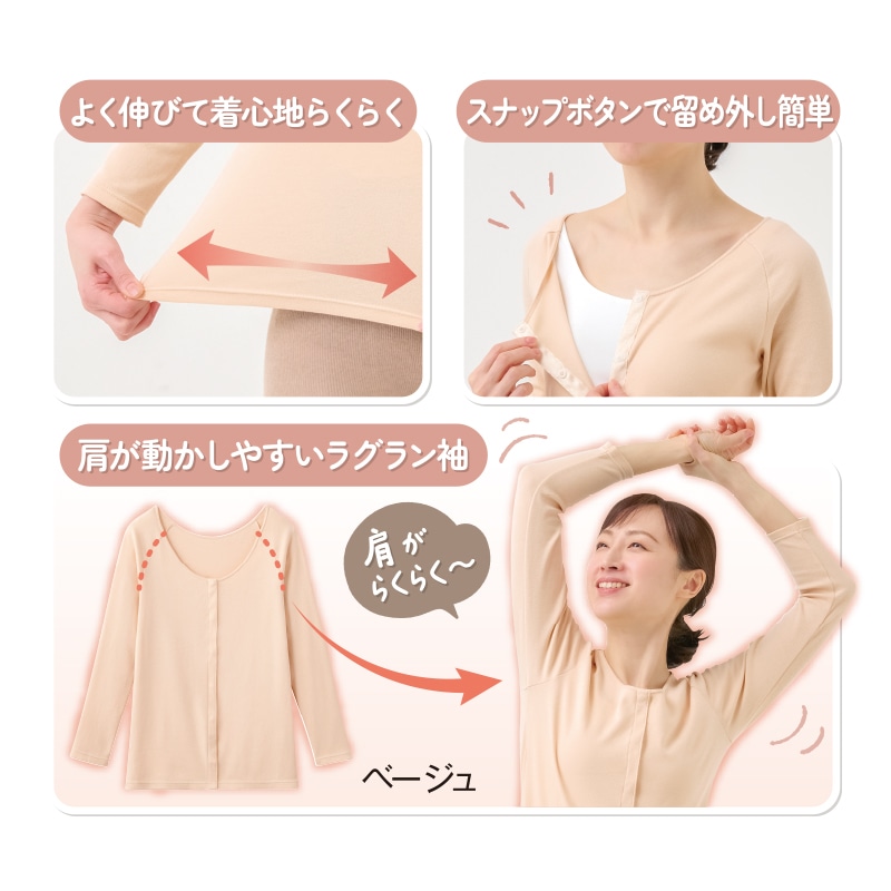 よく伸び、肩が動かしやすいラグラン袖の前開きインナー。スナップボタンです。