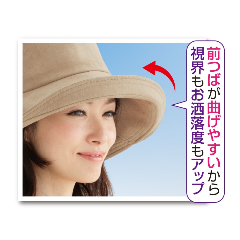 前つばは12cmのつば広(最大)でしっかりUVをカット。不要な時は簡単に曲げられるので視界もクリア。たためるので持ち運びもラクラク。