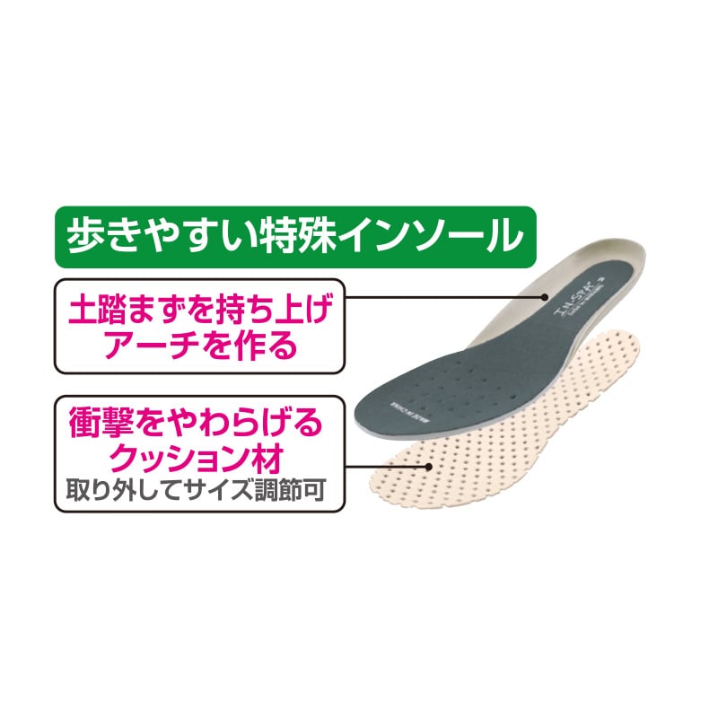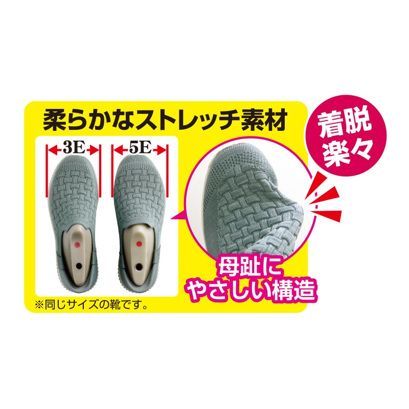 靴ベラ型の型崩れしにくく、かかとにそった特殊形状で、立ったままラクに足入れができるスニーカー。柔らかなストレッチ素材で拇趾にやさしい構造。5Eまでの足幅へ対応します。軽量です。