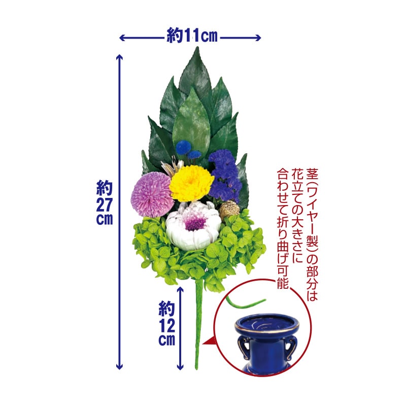 - セット内容/プリザーブドフラワー(椿葉、アジサイ、小菊、輪菊、他) サイズ(約)/高さ27×横11㎝ 日本製 *花器は付属していません。 *生花から製造しているため、大きさ、色合いなどが写真と異なる場合があります。 *茎を曲げ容器に差し込む際、茎の中の針金が、手を傷つける恐れがあります。くれぐれもご注意ください。 *プリザーブド加工は永久に効果が続くものではありません。高温多湿などの環境下では製品寿命が短くなります。