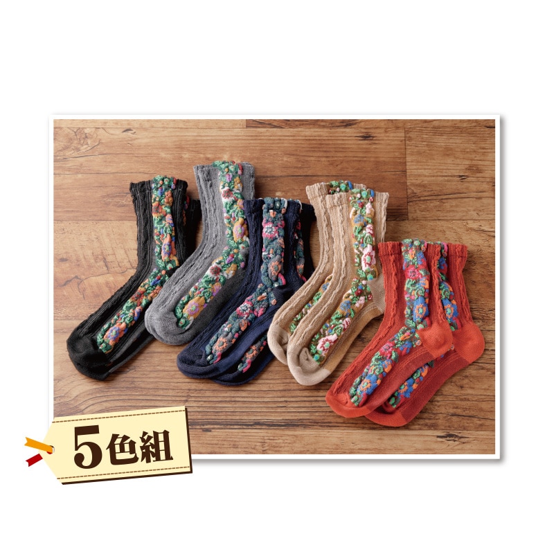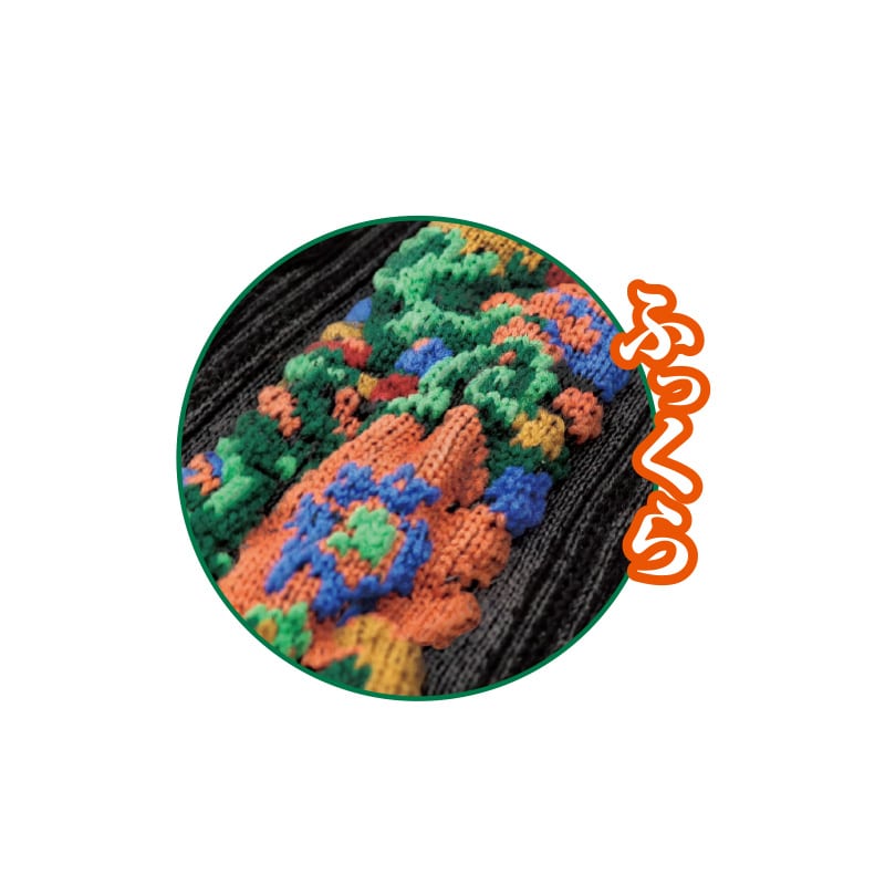 - 特殊な技法で表糸を部分的に飛ばして模様を浮かび上がらせるフロート編みで立体的な花柄が浮かび足元を華やかに演出。