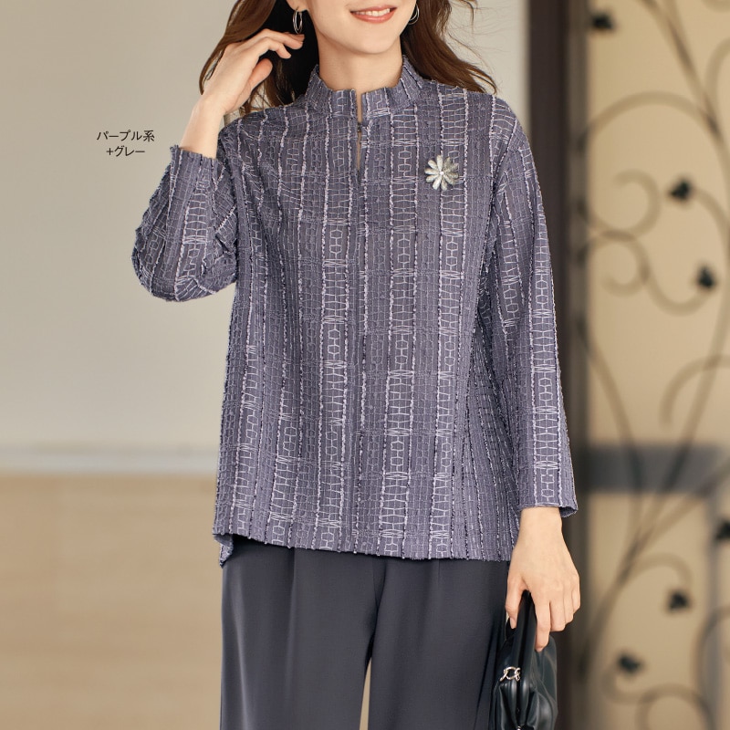 - 表情豊かで立体的な変わり織ブラウスは華やかな雰囲気。セットのセミワイドパンツは落ち感のきれいな合繊生地で着こなしをスマートに印象づけてくれます。