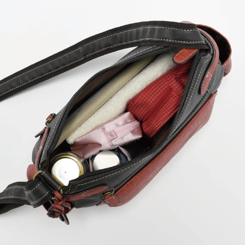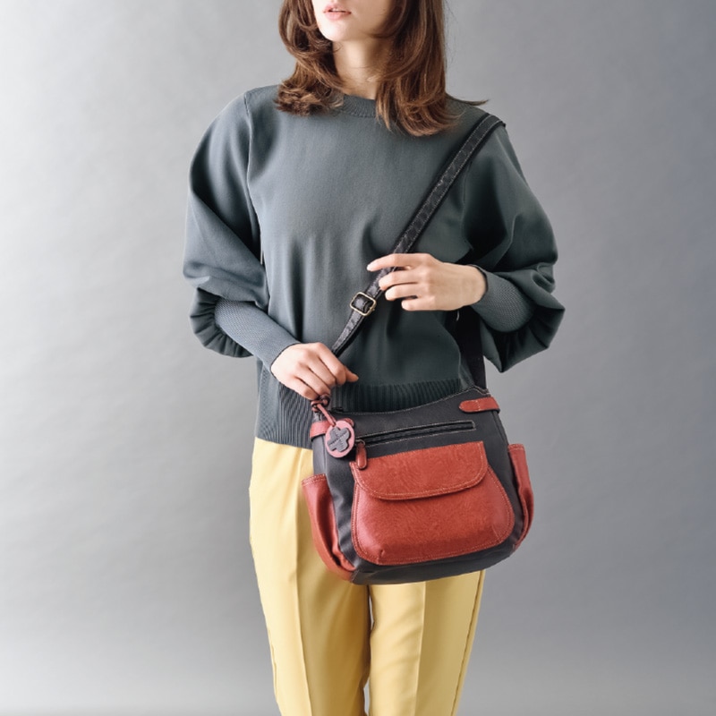 - 上品な配色とコロンとしたフォルムが可愛らしいショルダーバッグ。ポケットも豊富で旅のお供としても便利。
