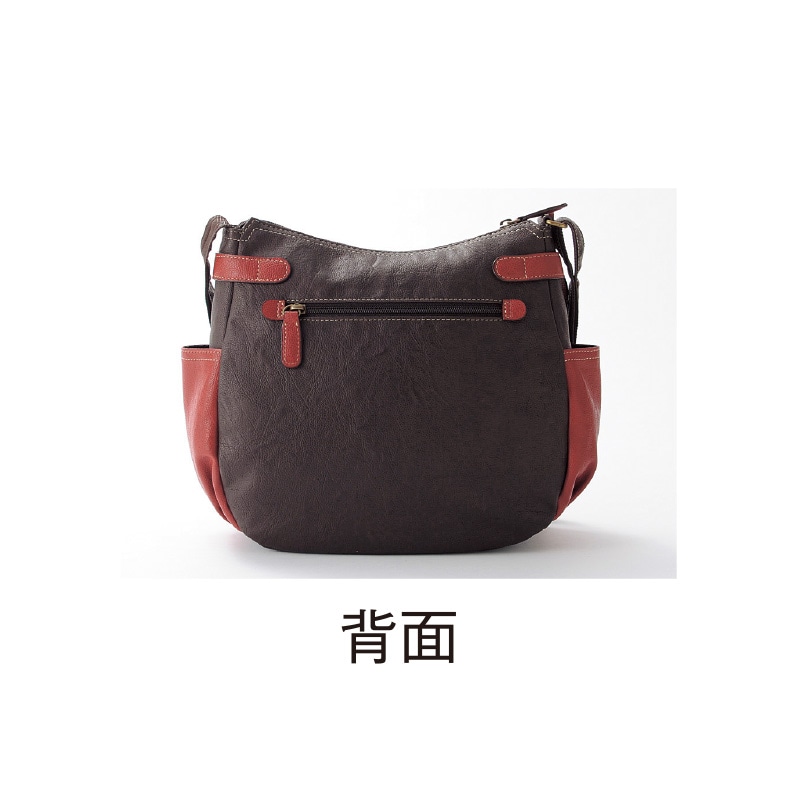 - 色/チョコ×ワイン サイズ(約)/タテ25×ヨコ26×マチ9㎝ ショルダー紐長さ:61~117㎝(フリースライド式) 重量(約)/430g 素材/外面:合成皮革 内側:ポリエステル 仕様/ファスナー式開閉口 外部:前面ファスナーポケット×1、前面かぶせマグホックポケット×1、サイドオープンポケット×2、背面ファスナーポケット×1 内部:オープンポケット×2、ファスナーポケット×1 中国製
