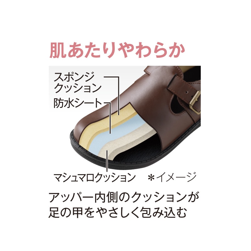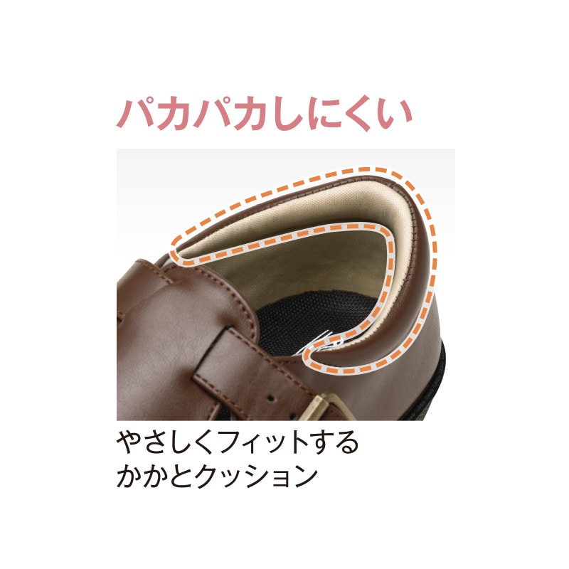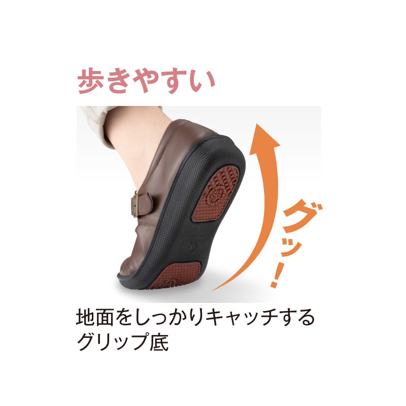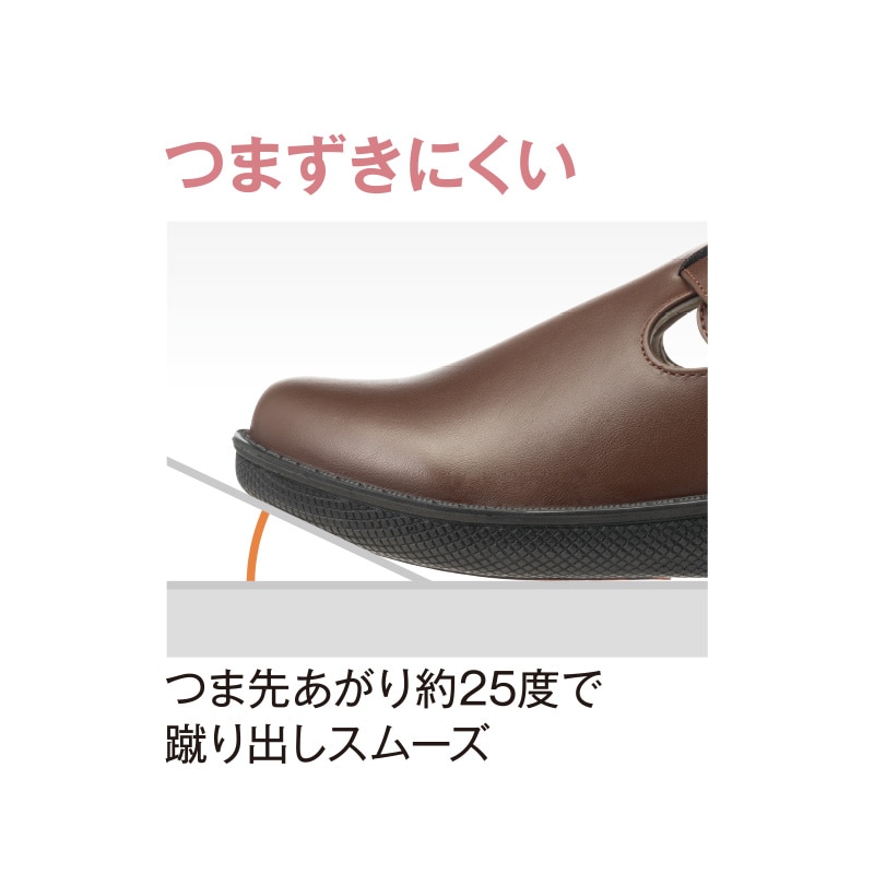 - 幅広ゆったり4E相当で、足の甲側の内側にはスポンジクッションで肌あたりやわらか。足にお悩みのある方にお勧めしたい一足。かかとにクッション、つま先は25度あげでつまずきにくい仕様、しかも雨の日にも安心の接地面より4cm4時間の生活防水、ソールはグリップ底です。