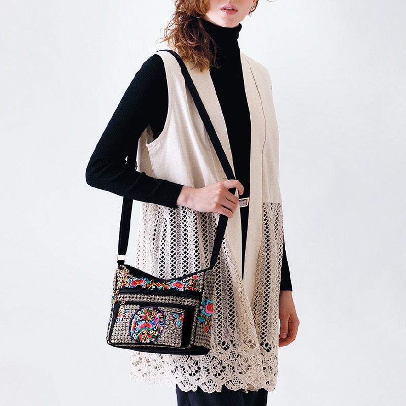 色/ブラック系 サイズ(約)/タテ22×ヨコ28×マチ11㎝ 持ち手立上がり:20㎝ 重量(約)/140g 素材/ポリエステル、綿、木仕様/ファスナー式開閉口 ※生産の都合により柄の出方が異なる場合があります。 中国製
