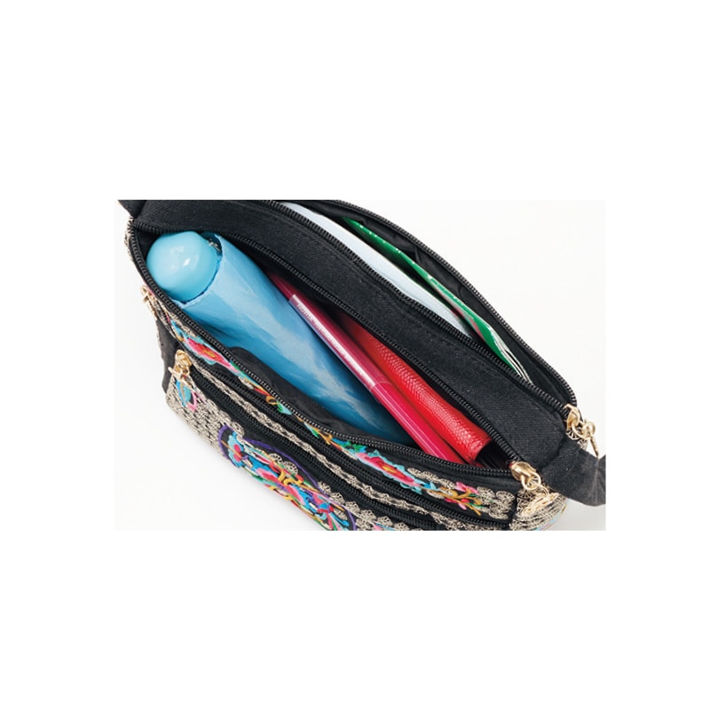 小物の仕分けがしやすい、前面の大小ポケットが便利。お出かけの必需品がちょうど入る大きさです。
