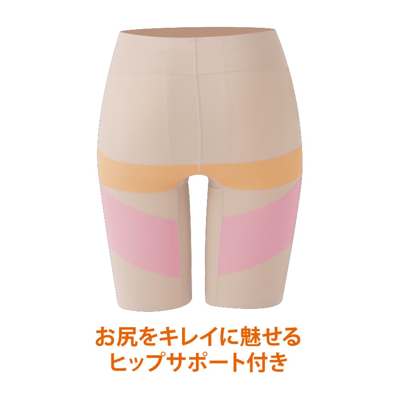 着用することで腹筋に力が入り、上体を起こす着圧サポート&立ち上がる時に負担のかかる太ももを持ち上げるようにサポートする機能付き。だからサッと立ち上がれて、足があがるから歩きやすい。お尻をキレイに魅せるヒップサポートもついています。