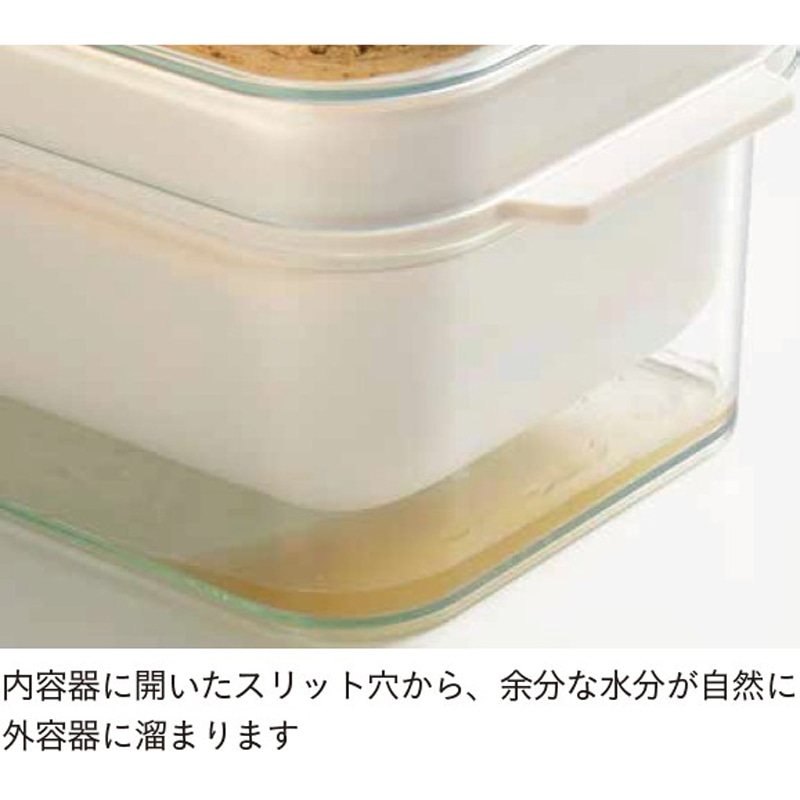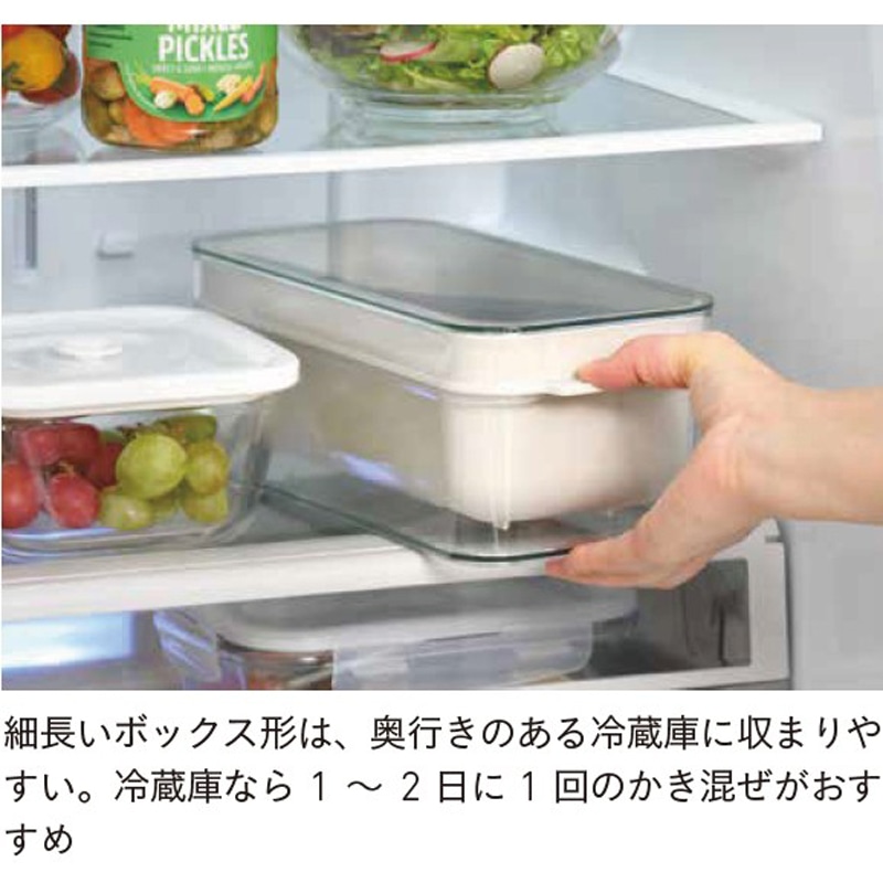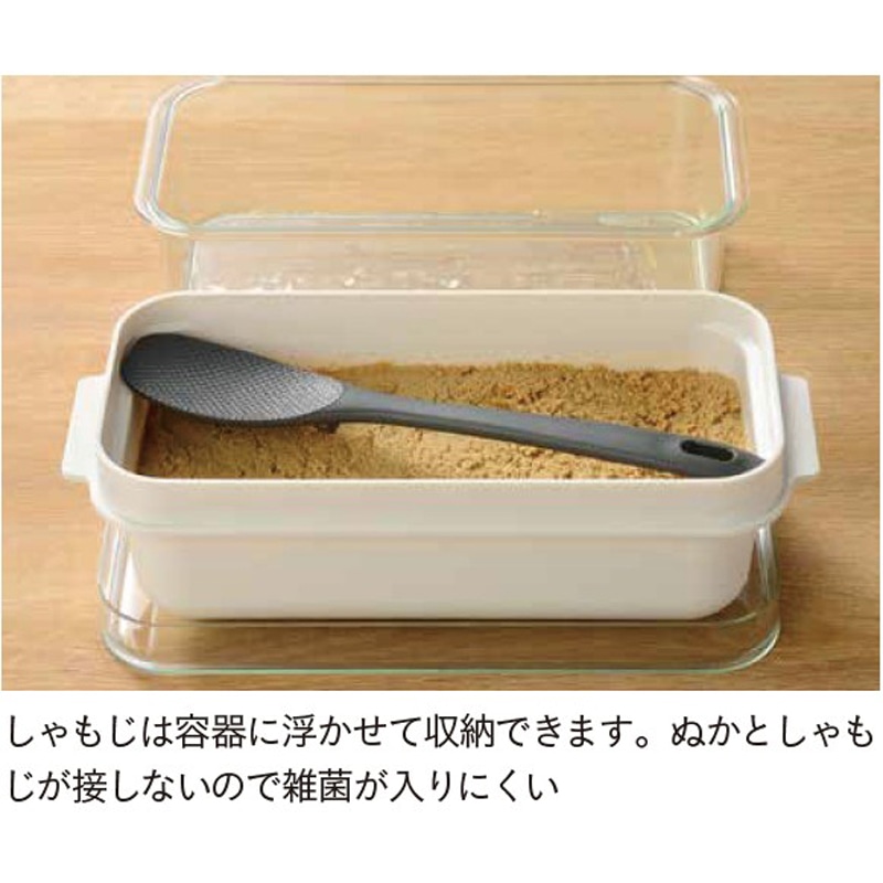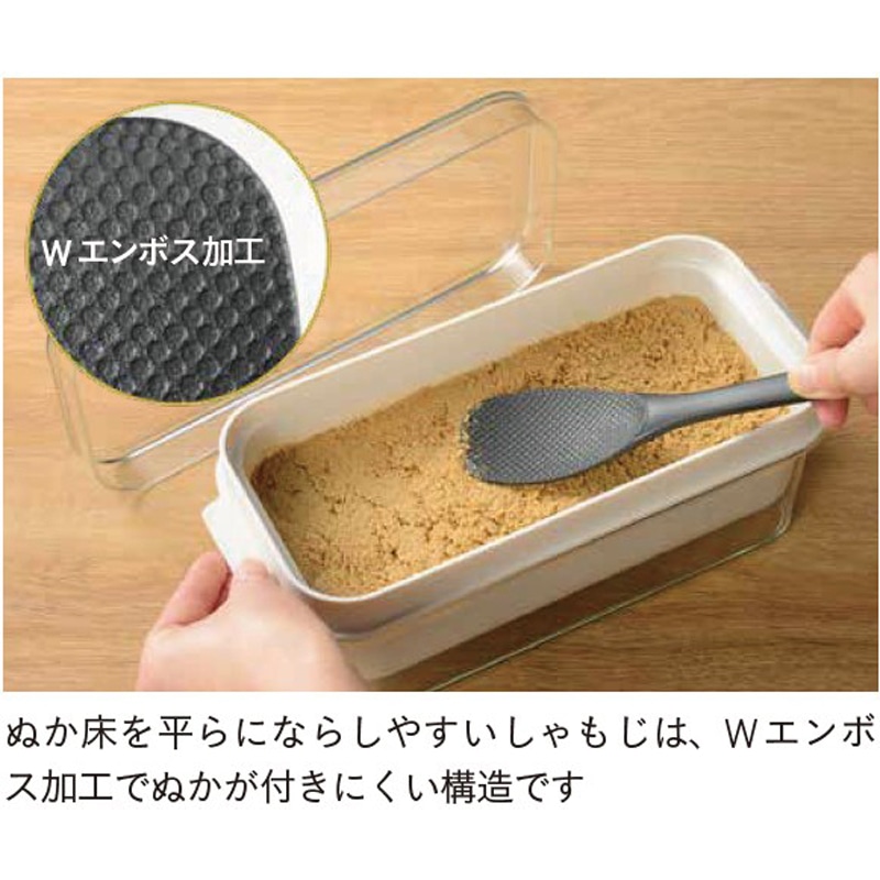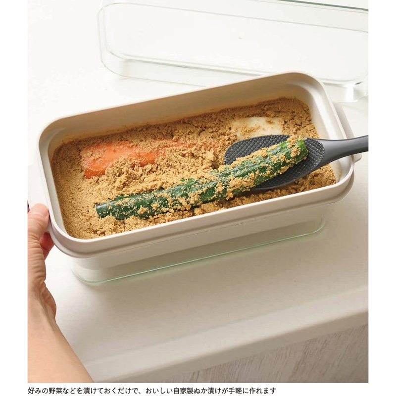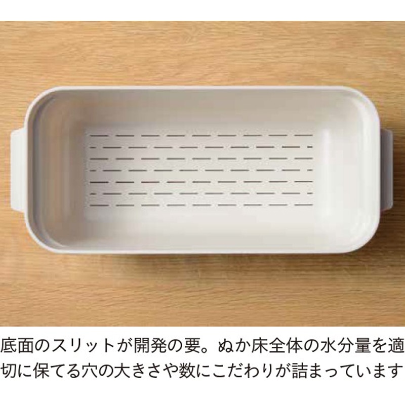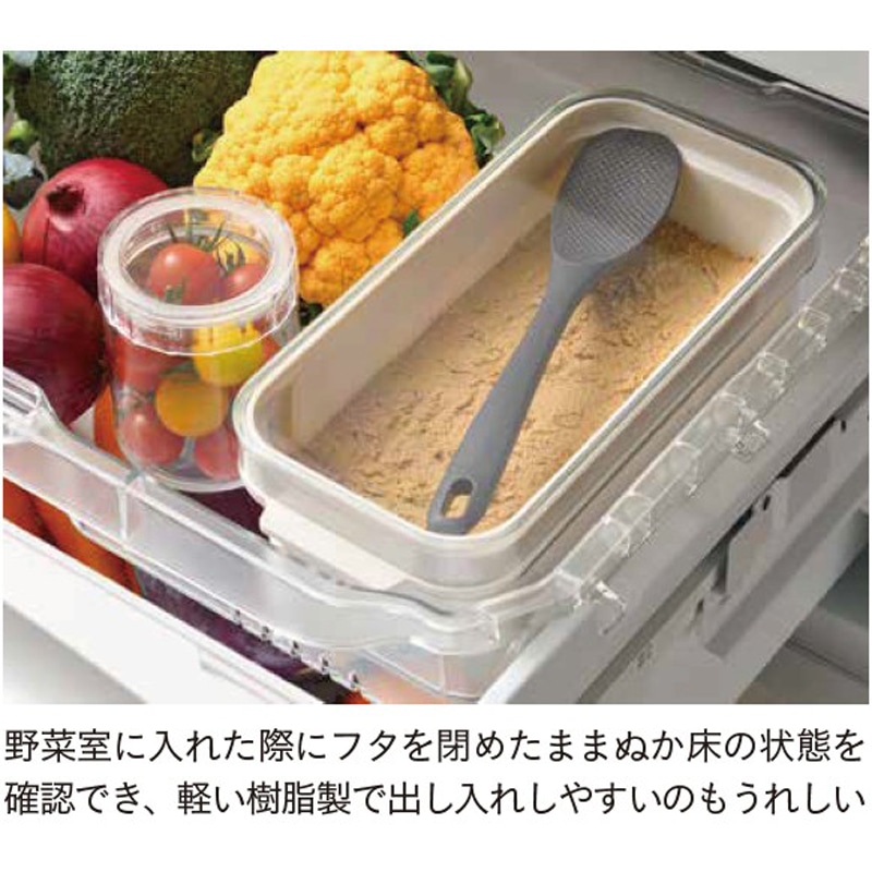 内容器の底に開けられたスリット穴から、余分な水分が外容器に溜まり、外容器の底に溜まった水分を捨てるだけで水抜きができるので管理がとってもラク。手を汚さず混ぜられる便利な専用しゃもじも付属しています。しゃもじは容器に浮かせて収納できるので、ぬかとしゃもじが接しないので雑菌が入りにくい設計です。冷蔵庫に収まりやすいコンパクトさも人気。好みの野菜などを漬けておくだけで、おいしい自家製ぬか漬けが手軽に作れます。手間や負担が軽減されることで、発酵食品であるぬか漬けを食べる習慣を継続しやすくなります。食卓にもう1 品欲しいときにも便利。