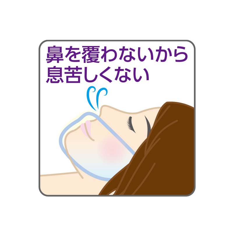 睡眠中の無意識の口呼吸がいびきやのどの乾燥の原因になっているかも。いびき・乾燥対策にはすやすや鼻呼吸マスク。鼻部分を覆わないので息苦しさが軽減され、また肌面はシルク100%で肌ざわりも抜群。自然に鼻呼吸の習慣をつけ、快適な眠りへいざないます。