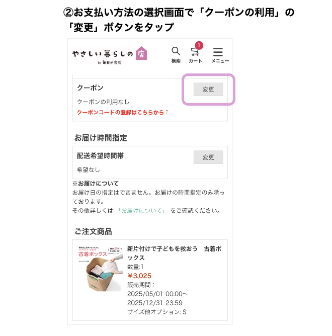 ご購入手続き内にあるお支払い情報「クーポン利用」の「変更」をクリックし、クーポンコード欄に「クーポン番号(6ケタ:半角数字)」を入力します。