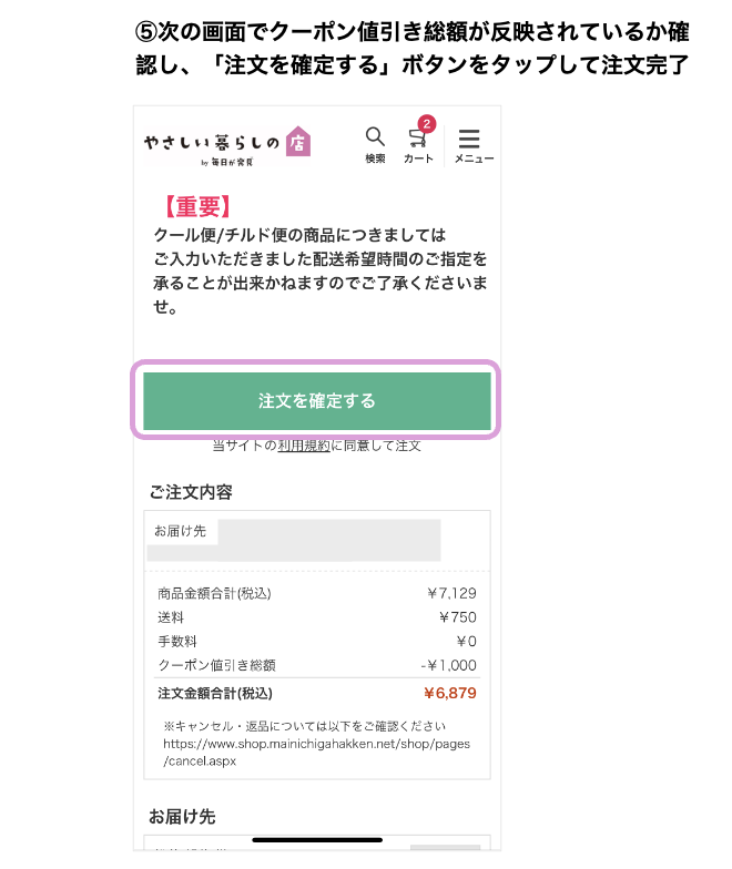 注文商品、お買いものクーポンの割引金額、お支払い合計、お届け先等の確認をしてください。